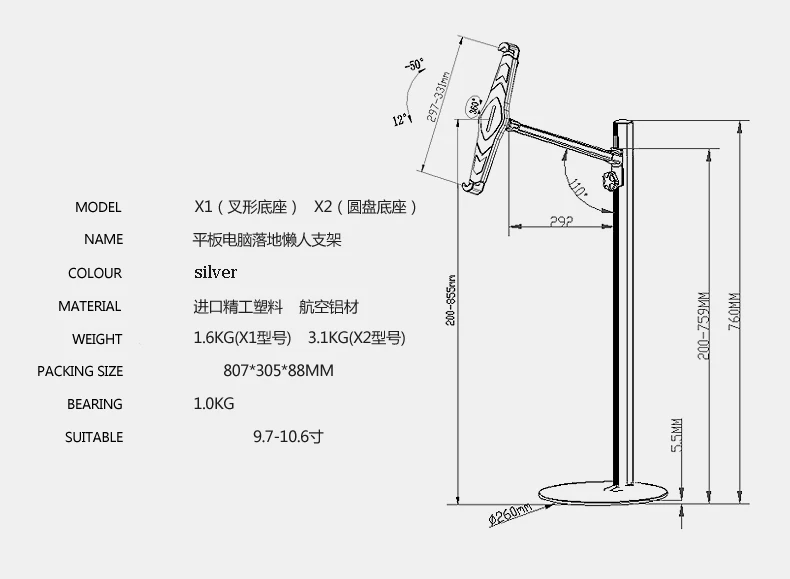 Product Name: Regolabile In Altezza/Angolo Di Visione Universale Pigro Tablet Bed Supporto Di Rotazione Di 360 Ergonomico Pavimento Basamento In Lega Di Alluminio Per IPad